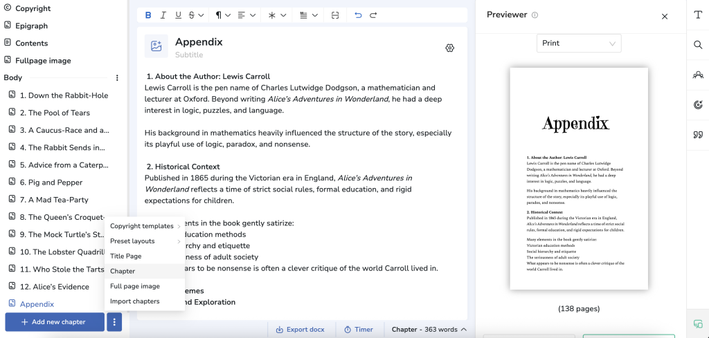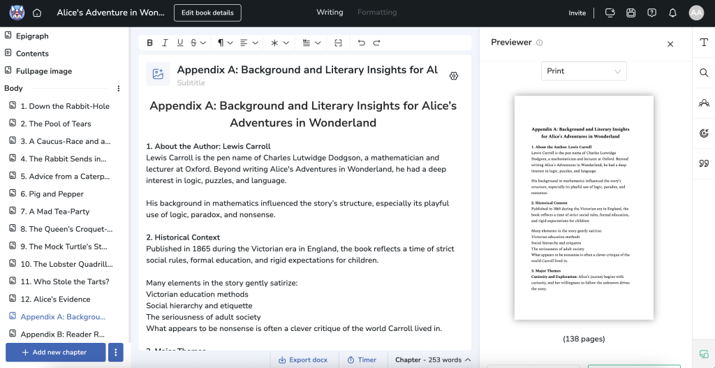 In the image below, you can see how easy it is to format your appendix in the Atticus writing tool. From naming the appendix to adding headings and inserting information, Atticus makes things as easy as possible — even for those who’ve never used a dedicated writing tool like this before.