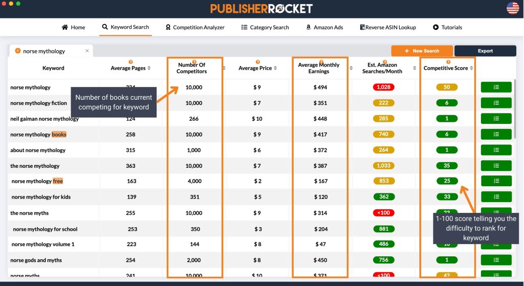 But, it does more than that. It also tells you how many searches those phrases get, how much money books make that rank for that phrase, and even gives you the competition score (a score of 1-100 with 100 being super hard to rank for).
